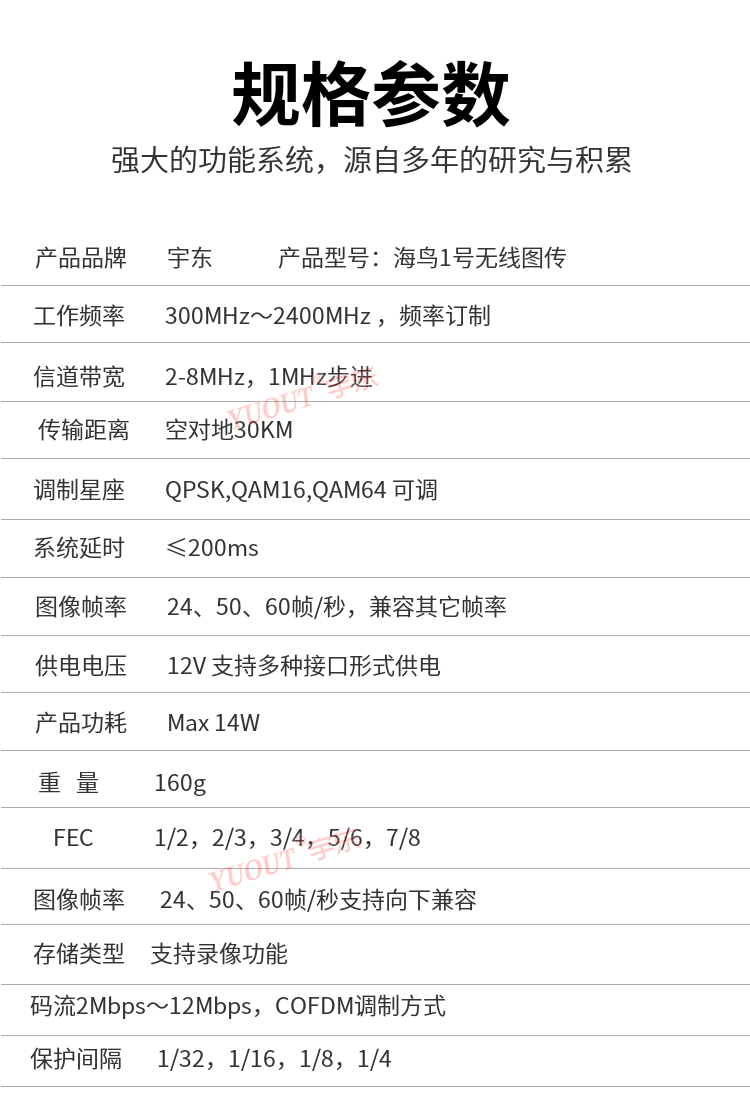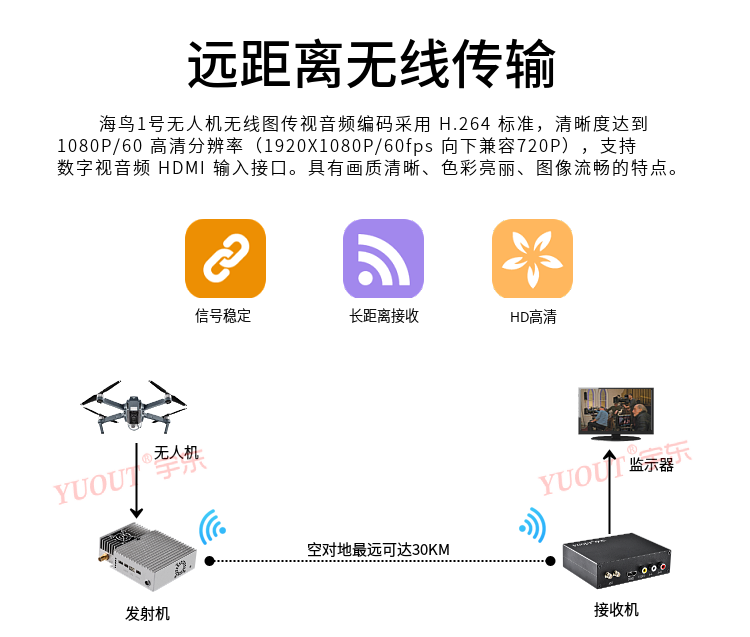 宇東海鳥1號無線圖傳高清微型無線視頻傳輸系統(tǒng),采用Coded Orthogonal Frequency Division Multiplexing:編碼正交頻分復(fù)用調(diào)制技術(shù),具有傳輸頻帶窄、很強的抗多徑干擾能力和抗多徑衰落能力,能夠?qū)崿F(xiàn)非視距(NLOS),高速運動情況下實時傳輸高質(zhì)量圖像。