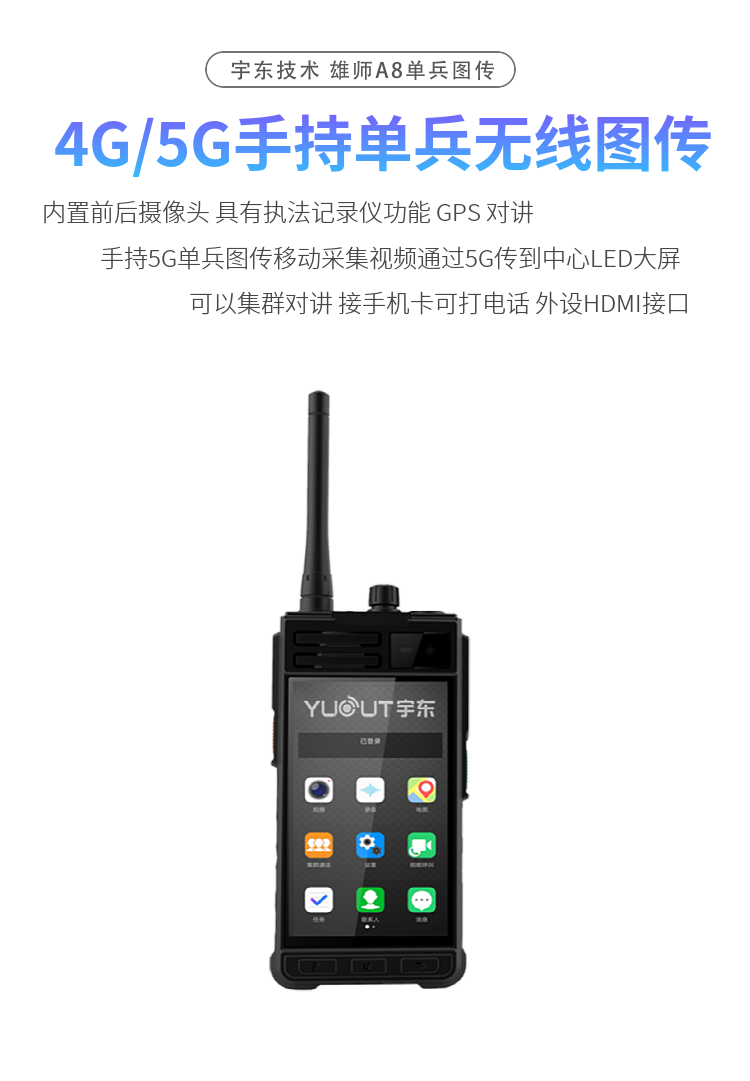 雄師A8 YD-TSP210-D-4/5G型執(zhí)行記錄儀終端是一款高性能的單人便攜型視頻產(chǎn)品,可提高前端人員執(zhí)法透明度、加強執(zhí)法人員與指揮中心實時溝通能力。該產(chǎn)品具有高清無線視頻圖傳、北斗/GPS定位、應急調(diào)度、集群呼叫、移動辦公、業(yè)務查詢等功能,可廣泛應用于公安、交/巡警、法院、消防、武警、人防應急、邊防、城管、保險理賠、工地施工、電力搶修、鐵路搶修、公司視頻會議、電力維修、消防救援、公路管理等場合。